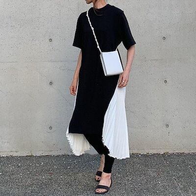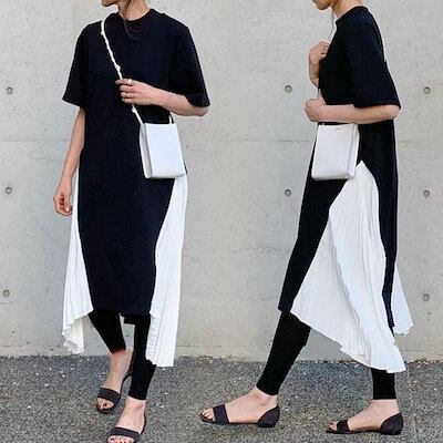 ワンピース レディース 40代 マキシ丈ワンピース 半袖ワンピース 配色 切り替えプリーツスカート ゆったり 上品 オシャレ カジュアル 韓国風 着痩せ 30代