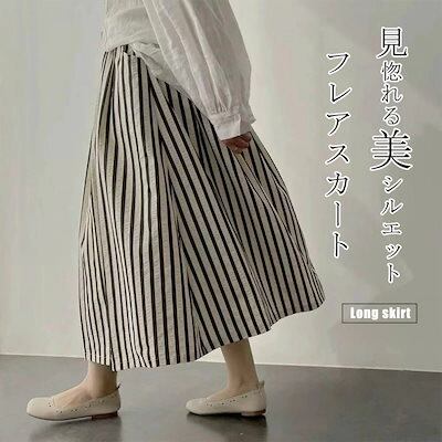 ロングスカートストライプ柄 スカート レディース フレアスカート マキシスカート Aラインスカート 体型カバー マキシ丈 フレア ゆったり 春 春物 ロング丈 ゆるっと ウエストゴム きれいめ お洒落