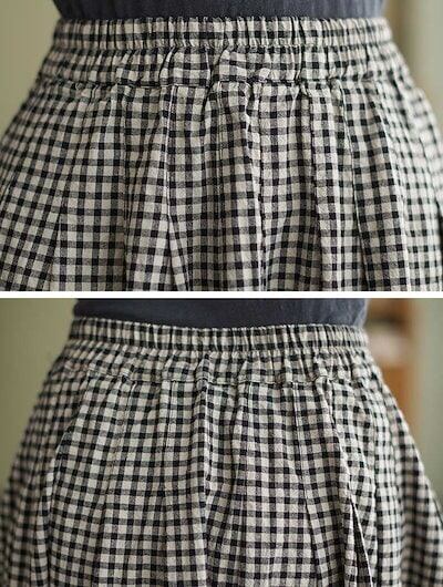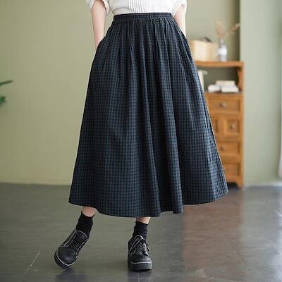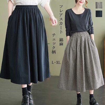ロングスカート レディース チェック 綿 麻 フレアスカート 春 夏 リネン ウエストゴム ハイウエスト スカート ポケット付き タック Aライン フレア ボトムス マキシ丈 ミモレ丈 ロング丈スカー