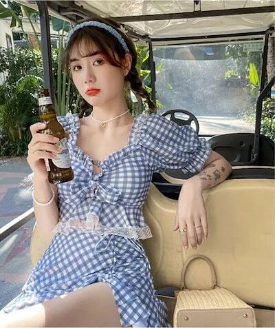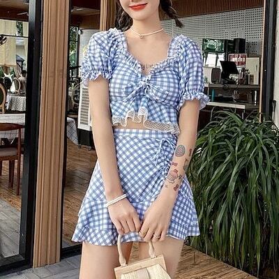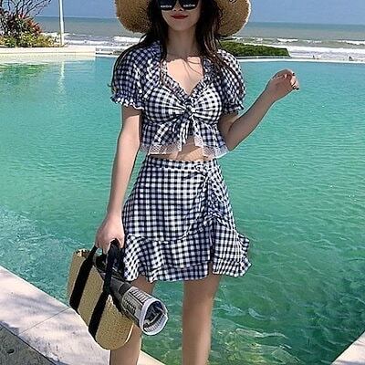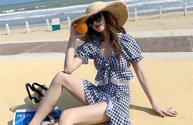【メガ割 】3色 水着 レディース ビキニ 上下セット ギンガムチェック かわいい 体系カバー ラブリー 袖あり