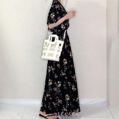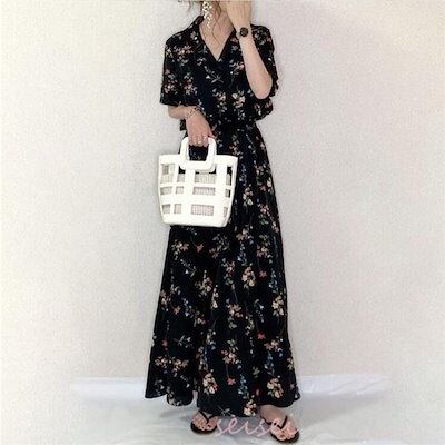 着痩せ ロング丈ワンピ 通勤 ワンピース ワンピース レディース 花柄 半袖 夏 マキシ丈ワンピース シフォンワンピ ワンピース キレイめ 夏 オシャレ Vネック