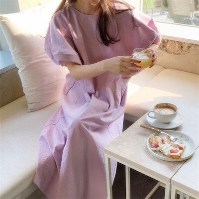 夏のワンピース 綿麻 バブル袖 ワンピ レディース 無地 ロングスカート 着痩せ
