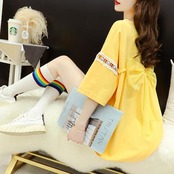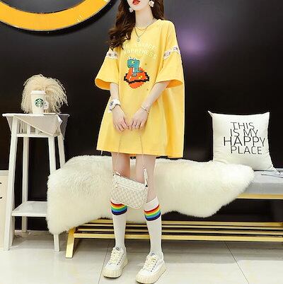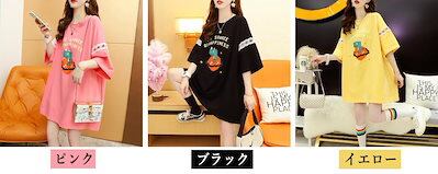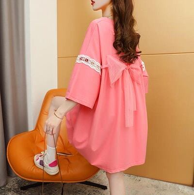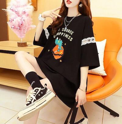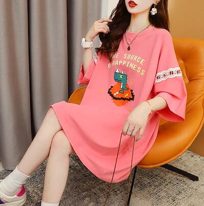 Tシャツワンピース ワンピ リボン レース ロングTシャツ ミディアム ロゴ プリント ロング ビッグシルエット 大きいサイズ 半袖 レディース かわいい 夏 M L 2L 3L