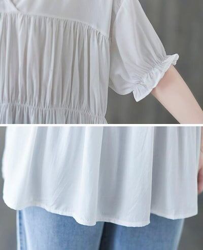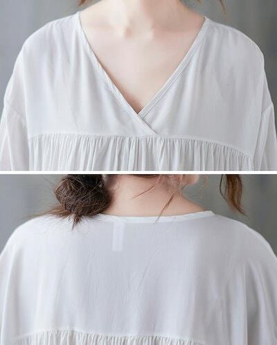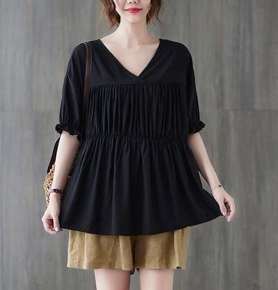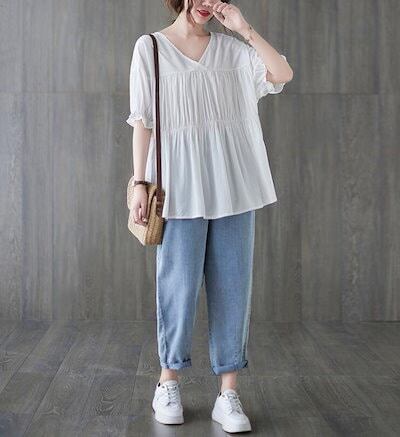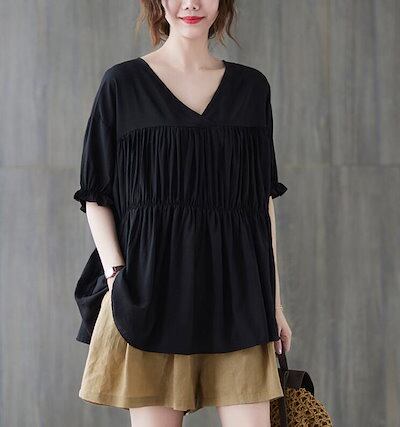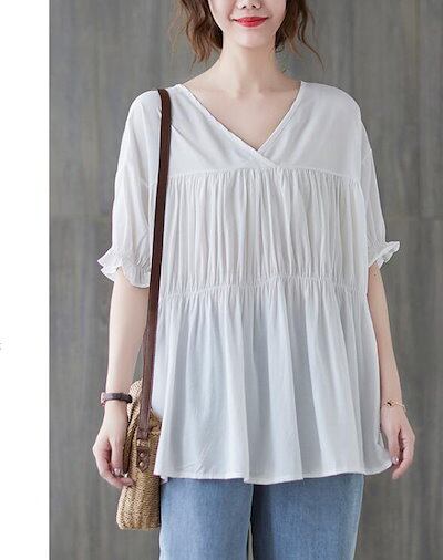 ブラウス レディース 半袖 ギャザーブラウス シャツ シャツ フレンチスリーブ フリル Vネック 5分袖 大きめ オーバサイズ サイズ 体型カバー 透け 涼しい 夏