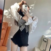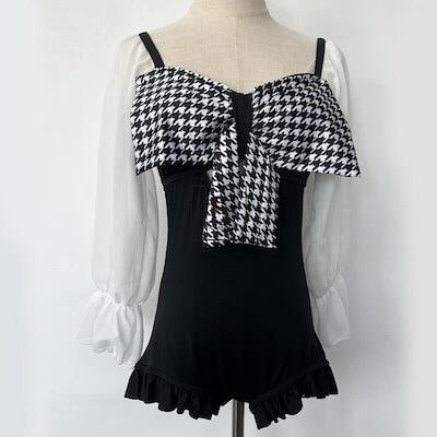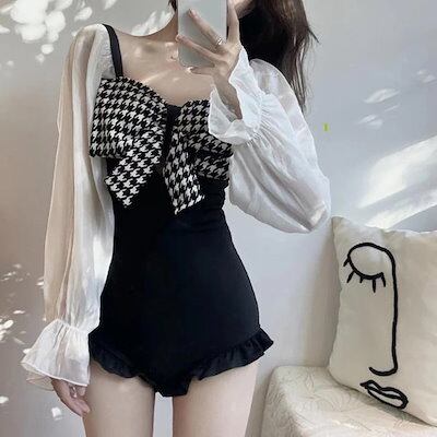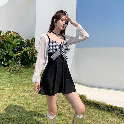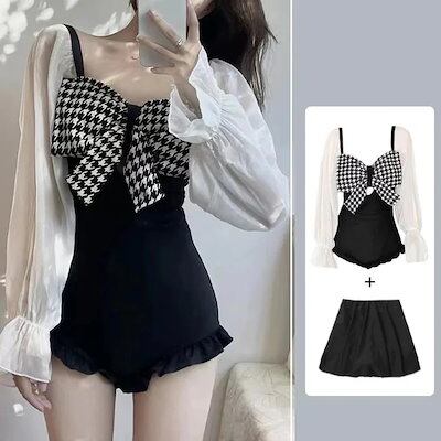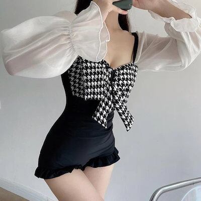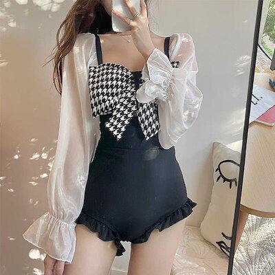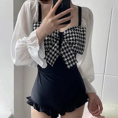 水着2点セット2WAYモノキニ水着スカート付き千鳥柄ビッグリボンフリルシースルー黒海リゾートプールビーチウェア海外旅行夏