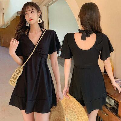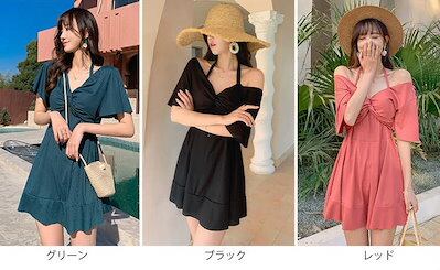 レディース水着半袖ワンピース無地フレアカジュアルママ水着ミセス体型カバー海ビーチリゾート海水浴プールスイムウエア春夏春夏休み旅行温泉タウングリーンブラックレッドMLXL2XL3XL