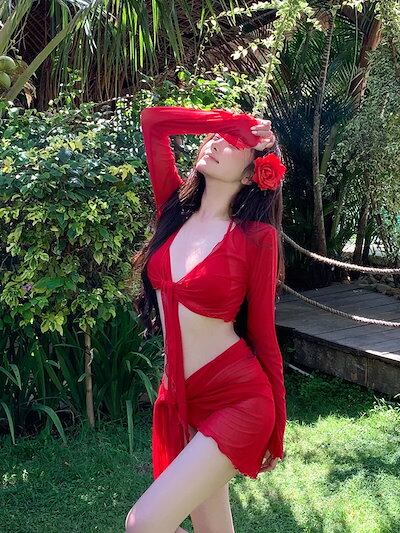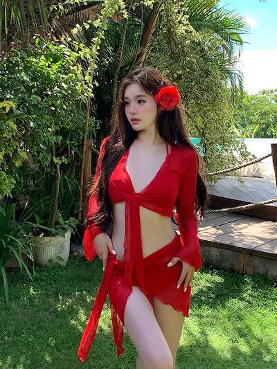 25 水着ファッション レディース ビキニ 水着 ワンピース 水着ワンピース リゾート温泉水着 体型カバー レッド 4点セット長袖 旅行