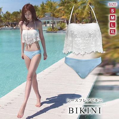水着バンドゥビキニ 2024 レディース 2点セット レース フリル 大きいサイズ ホルターネック レース スイムウエア セット 女性用 SMLサイズ