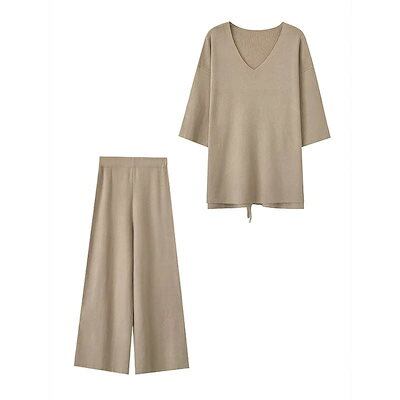 レディース 上下2点セット ニット Vネック ワイドレッグパンツ アンクルパンツ カジュアル 可愛い フェミニン きれいめ 上品 エレガント おしゃれ お出かけ オフィス お呼ばれ ベージュ ブラ