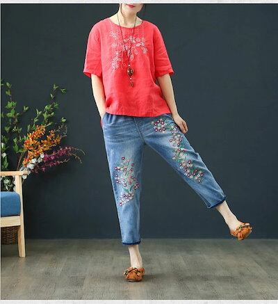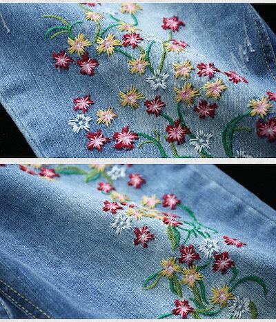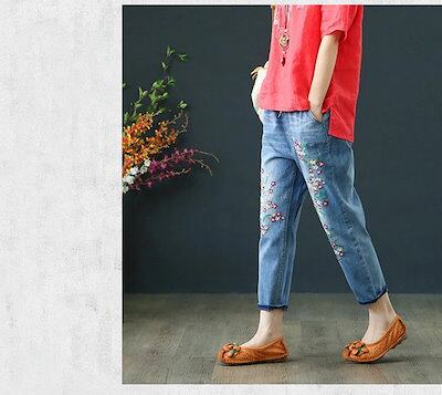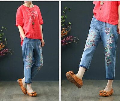 デニムパンツ レディース 大きいサイズ サルエル ジーパン サルエルパンツ ジーンズ デニム パンツ アンクル丈 カジュアル パンツ ボトムス ゆったり バイカラー ウエストゴム 楽チン 刺繍 無地