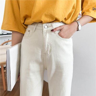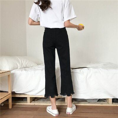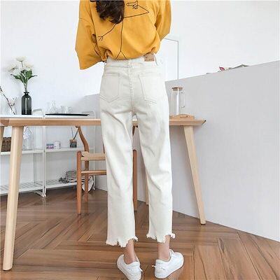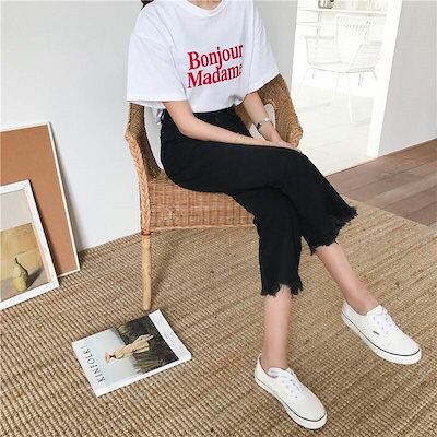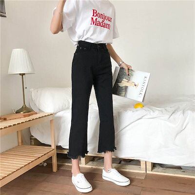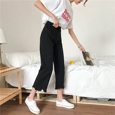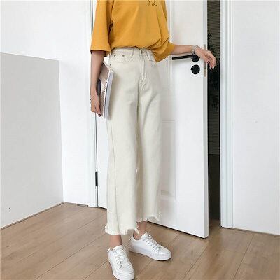 2色 デニム パンツ ジーパン レディース 9分丈 ワイド 切りっぱなし ハイウエスト 黒 白 無地 ジーンズ ボトムス ロングパンツ アンクル丈 綿 デニム きれいめ シンプル カジュアル 大人 お