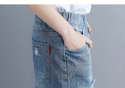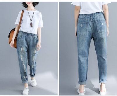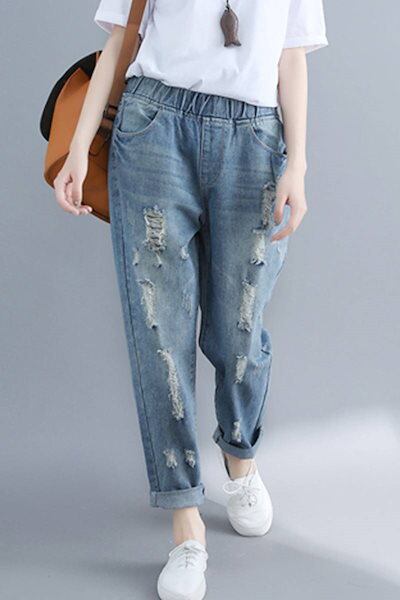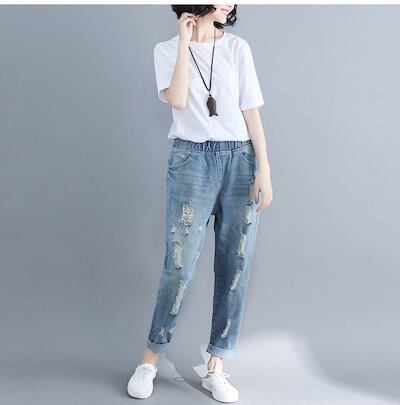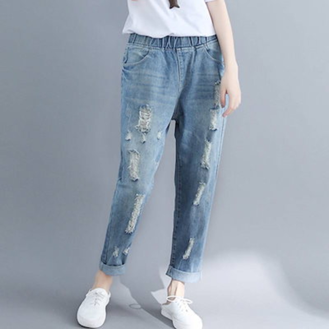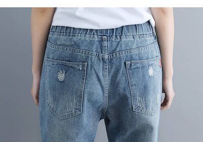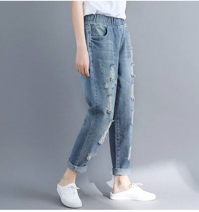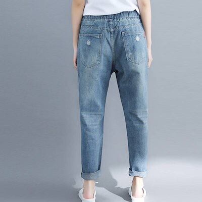 デニムパンツ レディース パンツ ジーパン ジーンズ ダメージ加工 ウエストゴム ゆったり ライトブルー 薄色 デニム XL 2XL 大きいサイズ ルーズ ハーレムパンツ アンクル丈 おしゃれ 可愛い