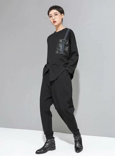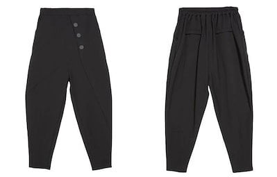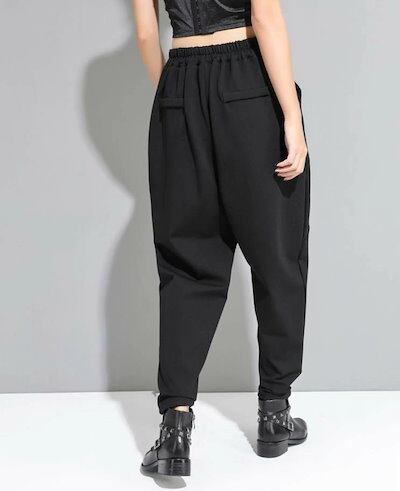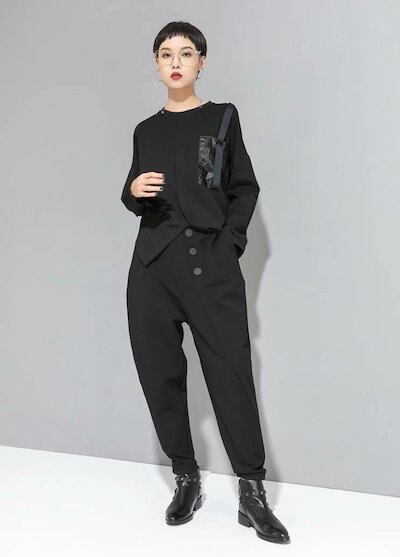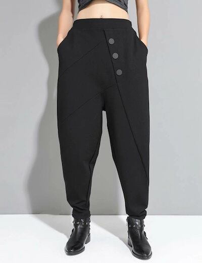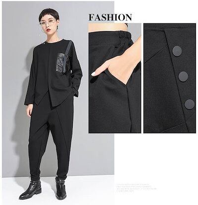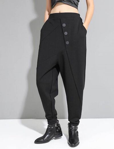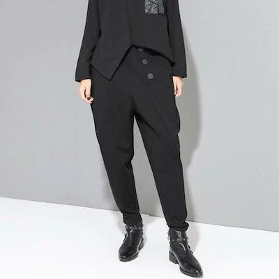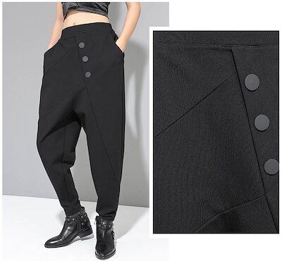 ボトムス ロング パンツ レディース テーパードパンツ 黒 無地 カッコイイ 個性的 アシンメトリー ドロップクロッチ ブラック フロントボタン 9分丈 アンクル丈 ズボン クロップド ワイド 切り替