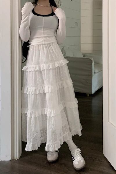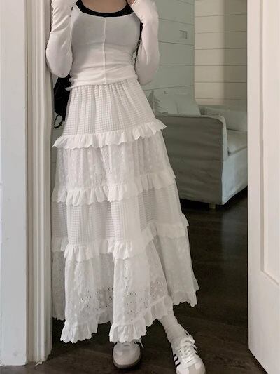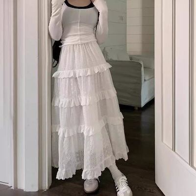 【2枚購入で300円 OFF!】バルーンスカートレディース ホワイトケーキスカートハイウエストミディアムジャカード小柄レーススカートロングスカート