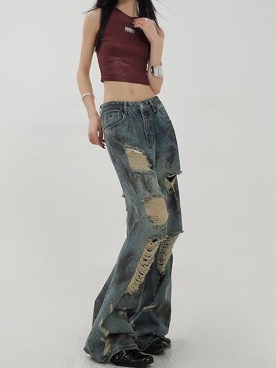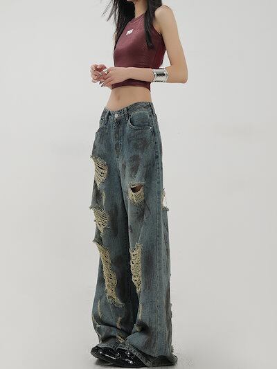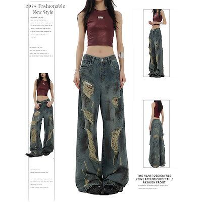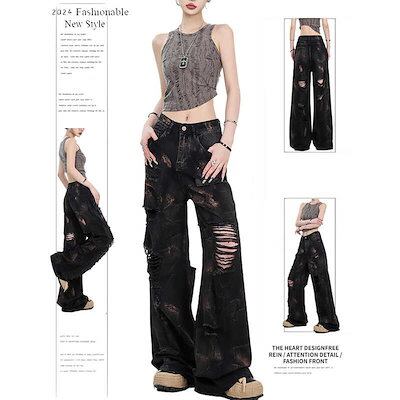 2025春夏 デニムパンツ ボトムス ハイウエスト ジーンズ K-POP ストリート系ファッション系韓国風ファッションウェア練習ジーンズ シルエット加工ゆったり黑レディースカジュアル型メンズライク衣装