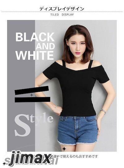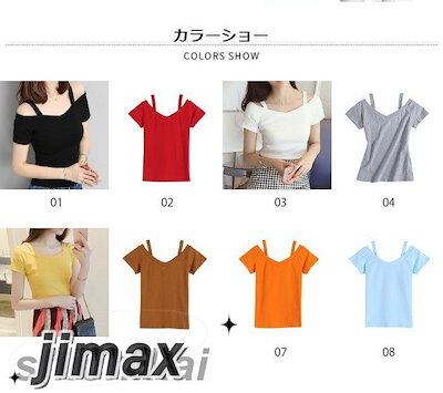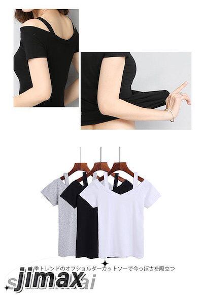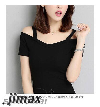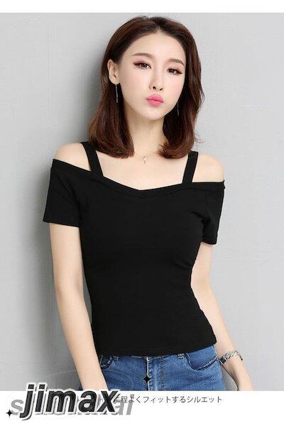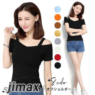 オフショルダー レディース Tシャツ カットソー 半袖Tシャツ オフショルTシャツ 無地 薄手 肩紐付き Vネック 伸縮性 ストレッチ プルオーバー トップス お洒落 セクシー カジュアル キレイめ