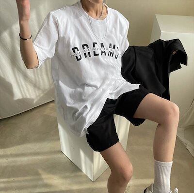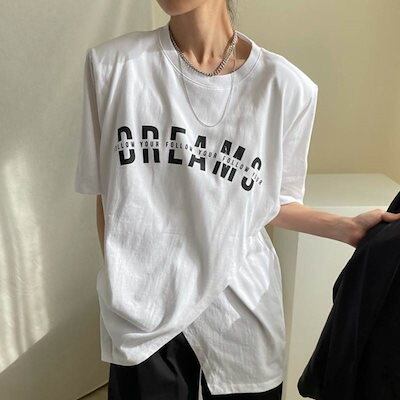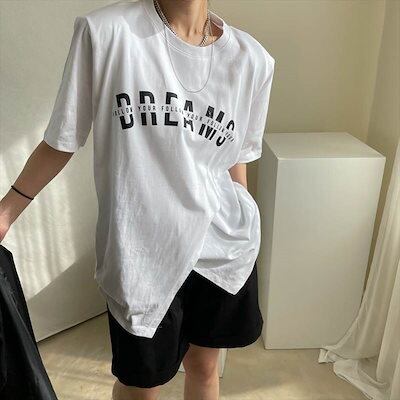 2色 トップス Tシャツ スポーティ 個性的 半袖 お姉さん ロゴ カッコイイ カジュアル クール 着回し ゆったりめ スタイリッシュ モテる 着痩せ レディース ワンサイズ フリーサイズ ホワイト