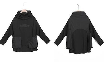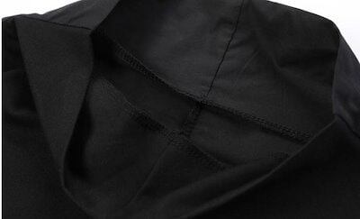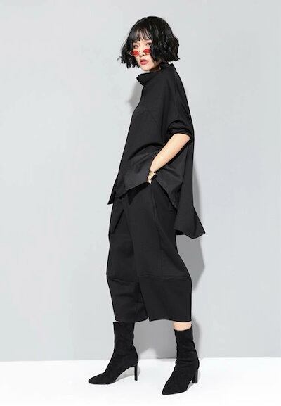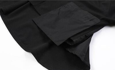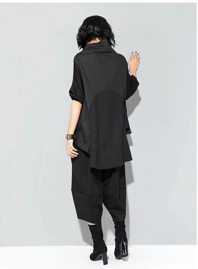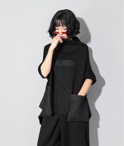 黒 トップス カットソー シャツ風 ロング丈 ブラック 5分袖 不規則デザイン スプリット アシメヘム ポケット ハイネック 異素材MIX プルオーバー レディース ロック 女の子 モード パンク カ