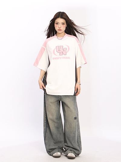 2025 春夏 トレンド トップスバイカラー甘辛MIX半袖 かわいいTシャツレディース韓国風ロゴ衣装ルーズゆったりカジュアルおしゃれサイズスリーブシルエットファッション系サイドシャツフットスウエット春