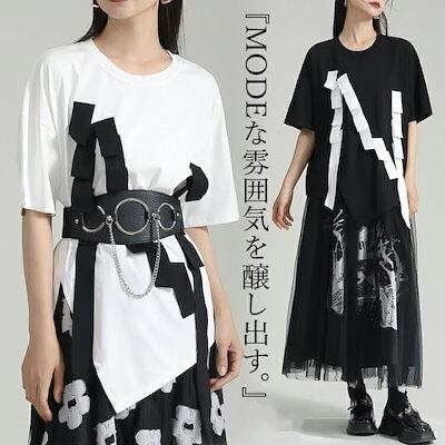 変形デザインロンT Tシャツ レディース 半袖 綿100% カットソー トップス ロンT モード系 変形 配色 アシンメトリー アシメ スリット 無地 チュニック 変形Tシャツ ロング ヘムデザイン今