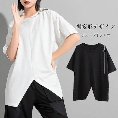 裾変形デザイン アシンメトリー Tシャツ レディース 春 夏半袖 トップス 綿 コットン クルーネック ツイストデザイン カットソー 無地 大きいサイズ チェーンTシャツ 変形Tシャツ モード系 大人