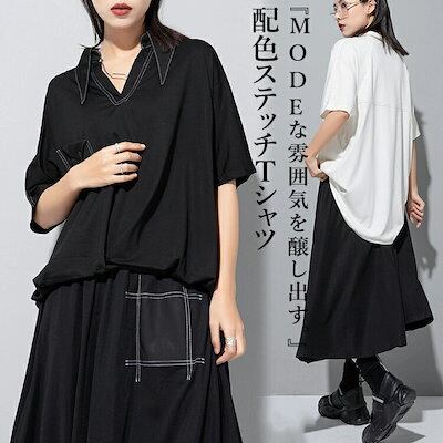 配色ステッチTシャツ Tシャツ レディース 半袖 モード系 トップス カットソー 前後差 アシンメトリー アシメロンT ヘムデザインTシャツ 無地 個性的 ユニセックス 大人 カジュアル ビッグシルエ