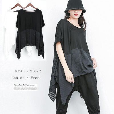 裾変形デザイン アシンメトリー Tシャツ レディース トップス 半袖 リネン コットン 異素材 切替 黒 白 クルーネック フレンチスリーブ ポンチョ風 裾切替カットソー プレゼント今日は30パーセン
