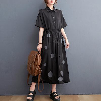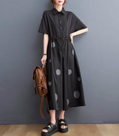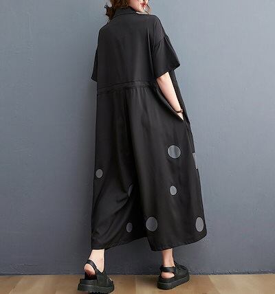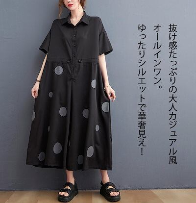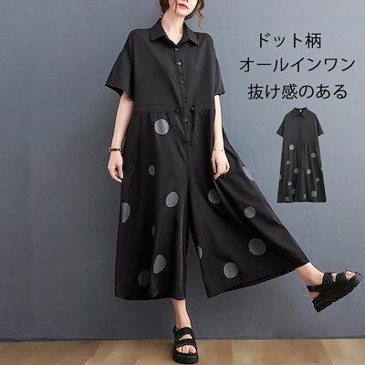 オールインワン レディース つなぎ 半袖 ドット柄 ツナギ ワイドパンツ オーバーオール ロングパンツ 折り襟 ポケット 体型カバー 長ズボン ゆったり 連体服 ジャンプスーツ 脚長 春 夏 秋 着痩