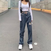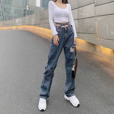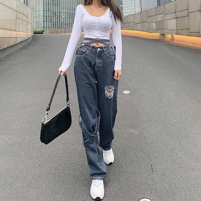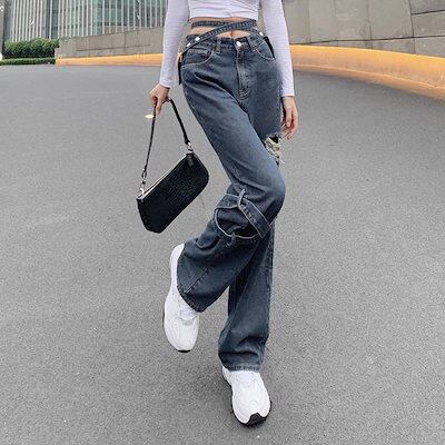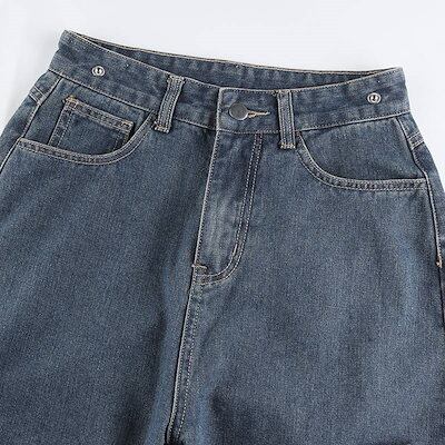デニム パンツ ボトムス ズボン ワイド ロング レディース ハイウエスト カジュアル おしゃれ かっこいい こなれ感 ラフ メンズライク マニッシュ ボーイッシュ キュート 抜け感 無地 夏 20代