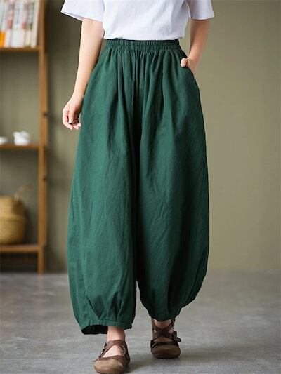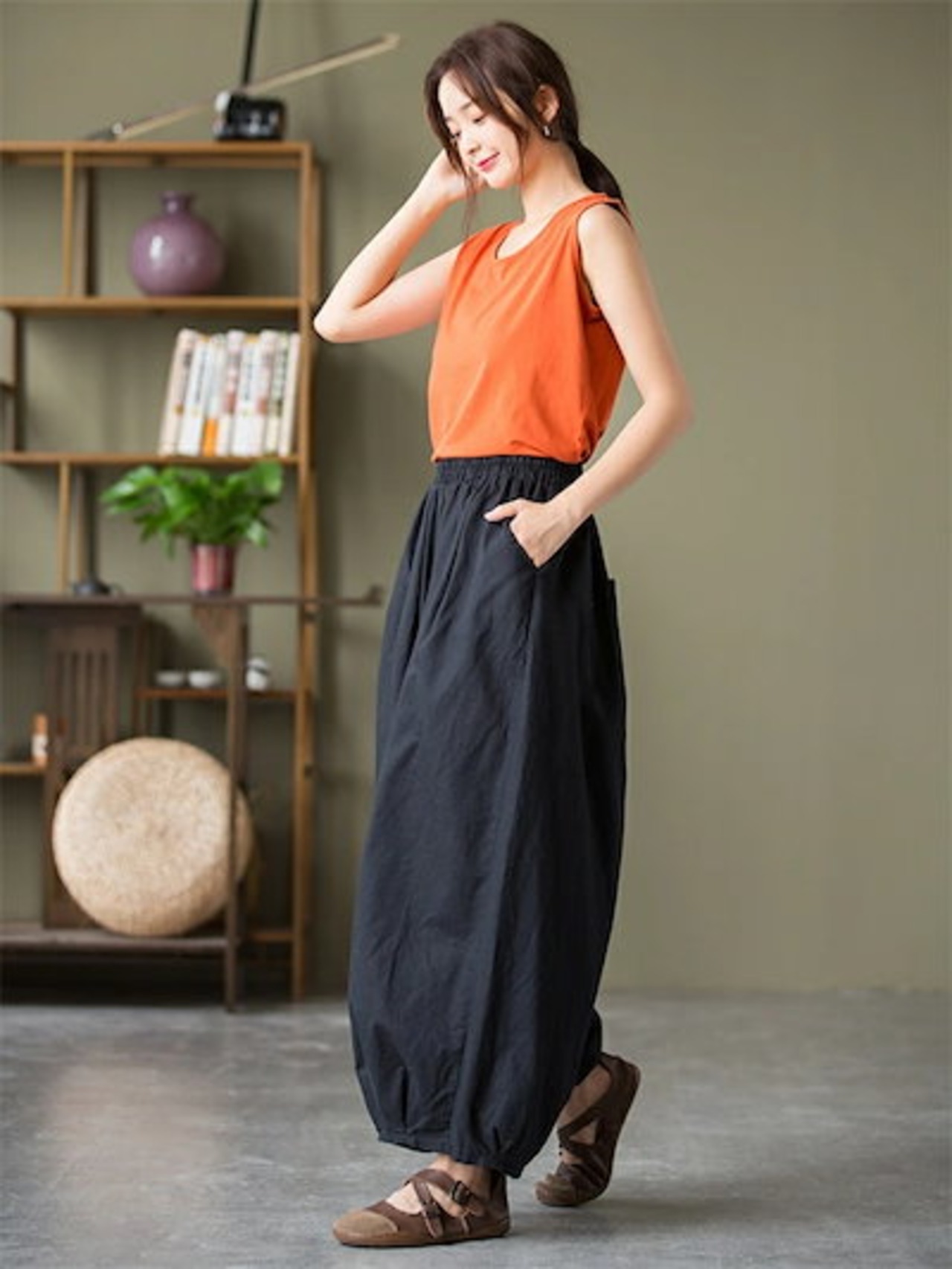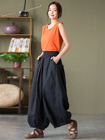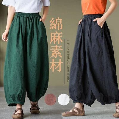 バルーンパンツ パンツ レディース サルエルパンツ ロング丈パンツ ボリェーム感 ウエストゴム アンクルパンツ サイドポケット ハイウエスト リネンパンツ 綿麻 体型カバー 長ズボン ロングパンツ ワ