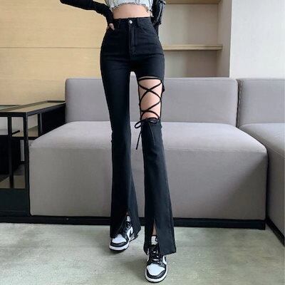 春夏新作レディー ハイウエストスリット上質な生地 帯のデザイン ハイウエストのズボ韓国 ズボン スキニーデニム ジーンズ ボトムス 美脚