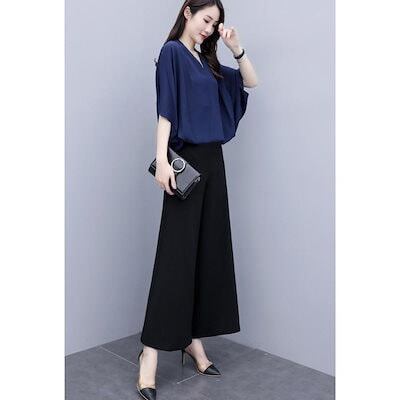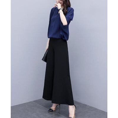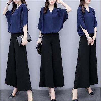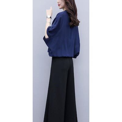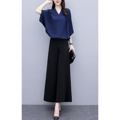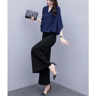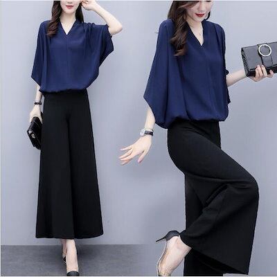 セットアップ レディース 春夏 オシャレセットアップ 半袖ブラウス 九分丈ワイドパンツ シフォン上下セット 通勤OL 30代40代 50代大きいサイズ
