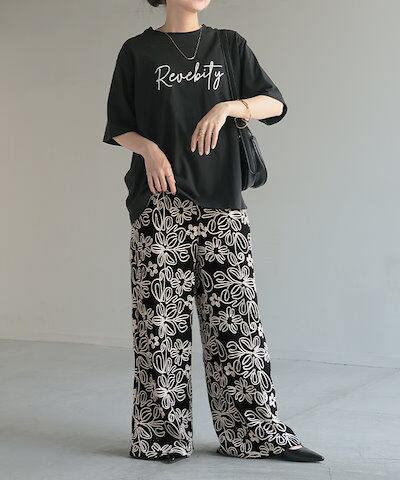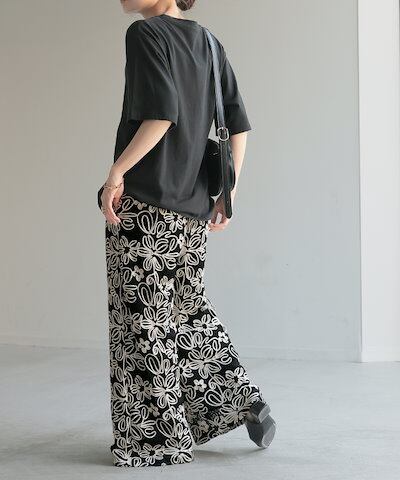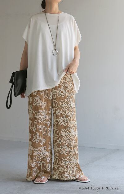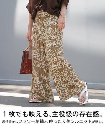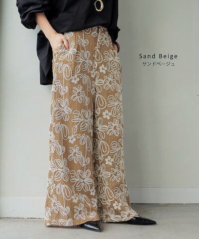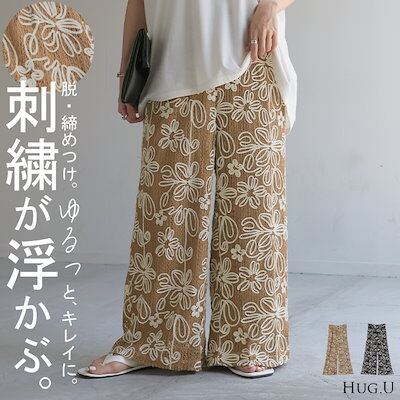 HUG.Uパンツ ワイド 総柄 透かし編み レディース ワイドパンツ 花柄 刺繍