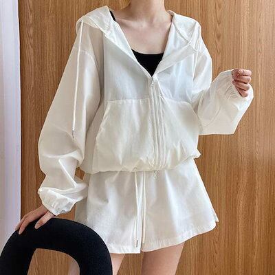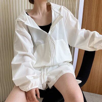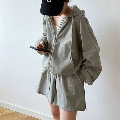 トップスUVカット紫外線対策UV対策パーカー春セットアップラッシュガードレディース夏オーバーサイズトップスジップアップショートパンツ無地薄焼け止め短ズボン長袖上下セット