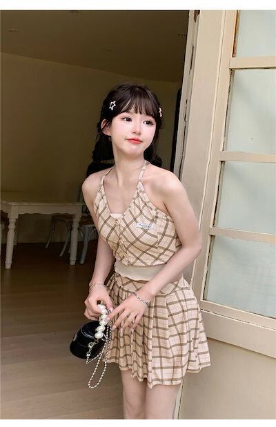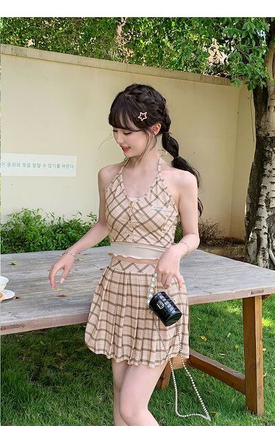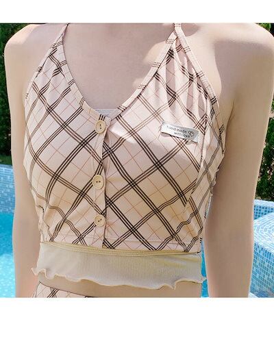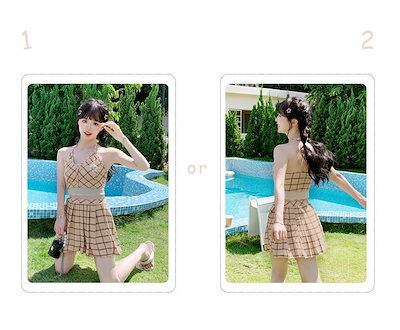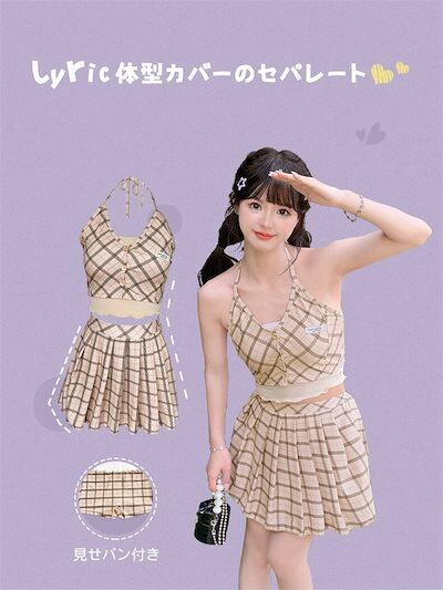 水着 レディース セパレート めくれ防止 チェック カーキ 体型カバー 女子水着 ショーツ付き セパレート スカート 肩出し フリル 可愛い 大人女子 20代 30代 二の腕 水着 ビキニ タンキニ