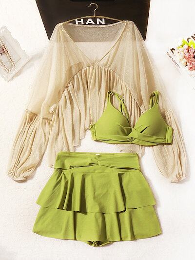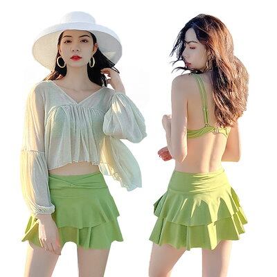 水着 体型カバー タンキニ 韓国 水着 レディース 小胸 緑 水着 セパレート 露出控えめ 大人 水着 体型カバー 可愛い 長袖 日焼け防止 海 プール 温泉 リゾート ビーチ