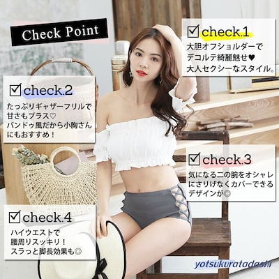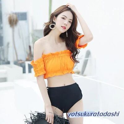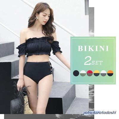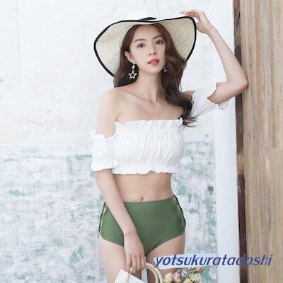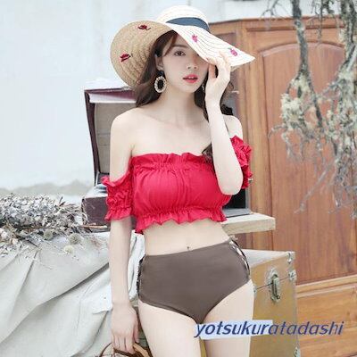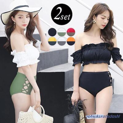 水着 ビキニ レディース 2点セット オフショルダー ギャザー フリル ハイウエスト 20代 30代 女の子 水着 レディース 可愛い 大きいサイズ 大人用 水着 体型カバー ラッシュガード スクール