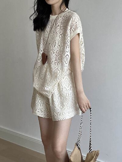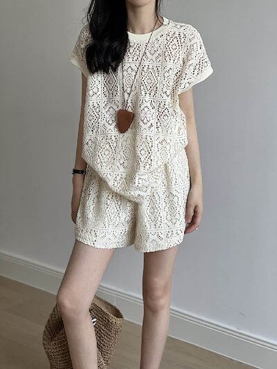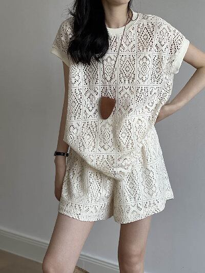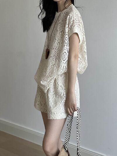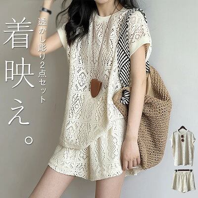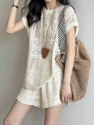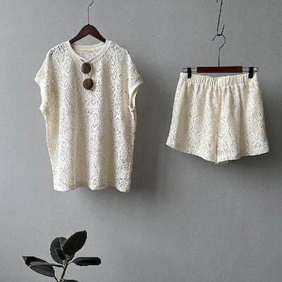 セットアップ レディース Tシャツ 半袖 ショート丈 パンツ トップス 透かし彫り ショートパンツ カジュアル 短パン ハーフパンツ 楽ちん 可愛い ゆったり シンプル トレンド感 ゆるっと 重ね着