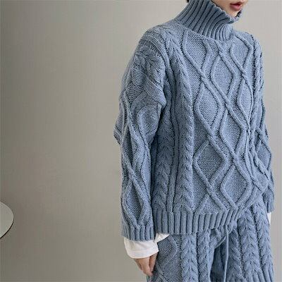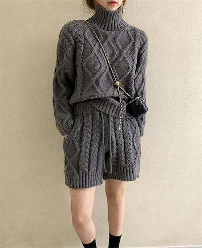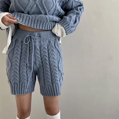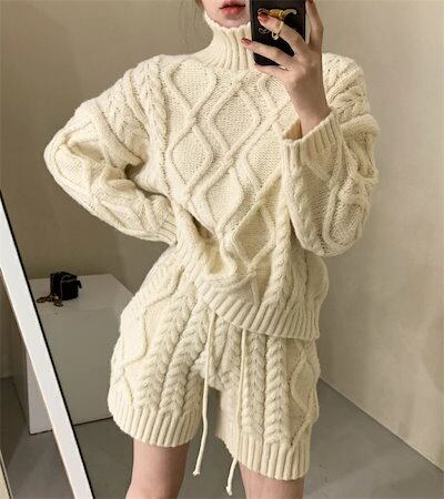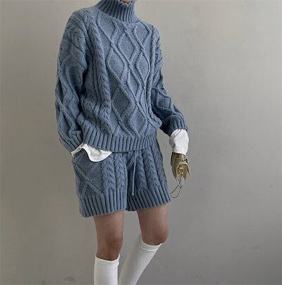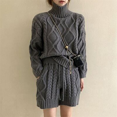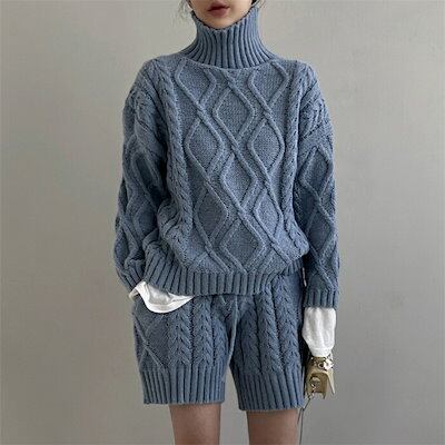 セットアップ ニット レディース 秋冬 ニットセットアップ 2点セット パンツスーツ 長袖 ハイネック ショートパンツ ショート丈 ハイウエスト ケーブル編み 無地 タートルネック ゆったり カジュア