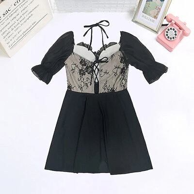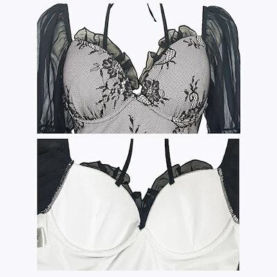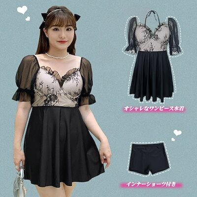 水着 レディース 大きいサイズ 4L 5L 6L 体型カバー ブラック ワンピース かわいい シースルー 透け感あり 二の腕カバー ワイヤー入り ショートパンツ Vネック レースアップ オフショルダー