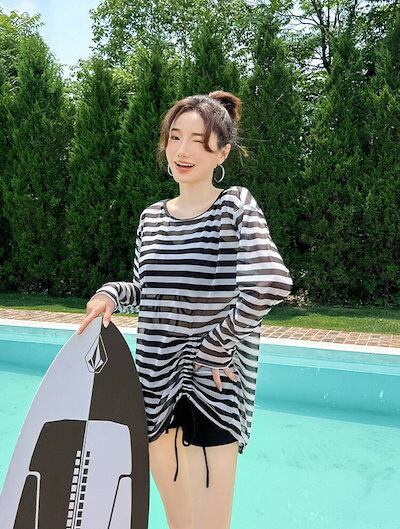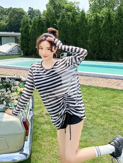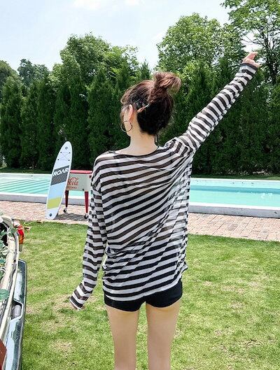 ボーダー 黒 水着 体型カバー 露出控え 中学生 高校生 レディース 3点セット 韓国 大学生 女の子 大きいサイズ ラッシュガード ショートパンツ タンクトップ セパレート セットアップ おしゃれ
