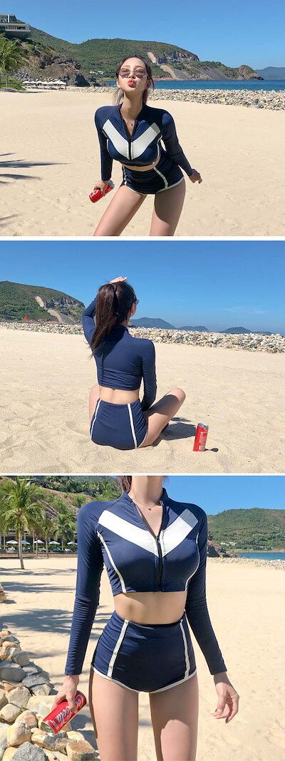新品 水着 韓国 露出控えめ 高校生 へそ出し スポーツ ショートパンツ 小胸 長袖 2点セット セパレート 細見え バイカラー シンプル レディース ガールズ 流行り 胸パッド タンキニ ビキニ