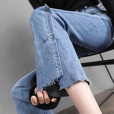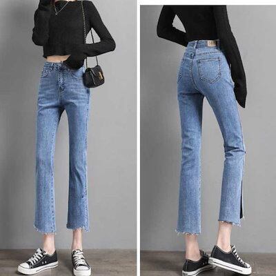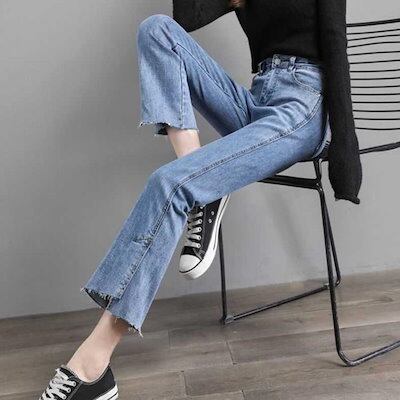 ブーツカットデニムパンツレディース大きいサイズスキニーデニムパンツフレアデニムパンツ8分丈9分丈春夏春脚デニムフリンジダメージジーンズジーパン裾フレア