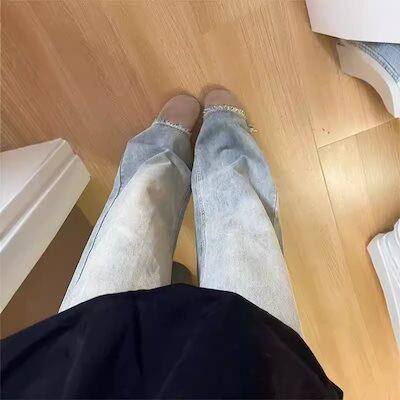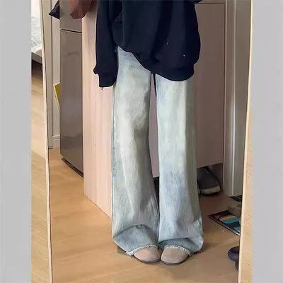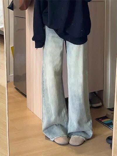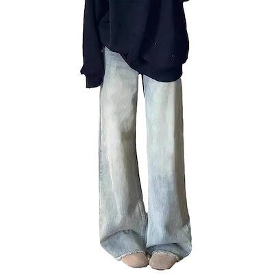 腰の高いストレートジーンズの女性の小さい人がズボンのレトロなバリの広い足を引きずってゆったりとした股を遮って痩せたズボンを見せます