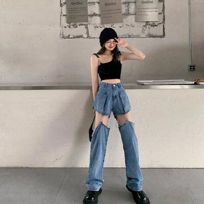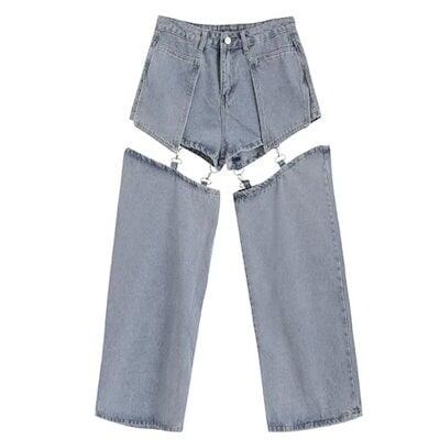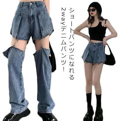 デニムパンツ2wayハイウエストロングパンツデニムパンツセパレート秋ショートパンツジーンズ無地半ズボン長ズボンゆったりストレートパンツ体型カバーワイドパンツダンス衣ストリート春秋夏レディース