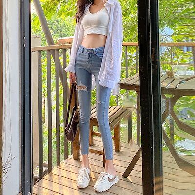 日韓新作 ダメージ スキニーパンツ ネットレッド ハイウエスト ジーンズ 脚長効果 体型カバー スリム見え 美脚 美尻 ジーンズひんやりボトムス