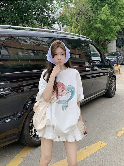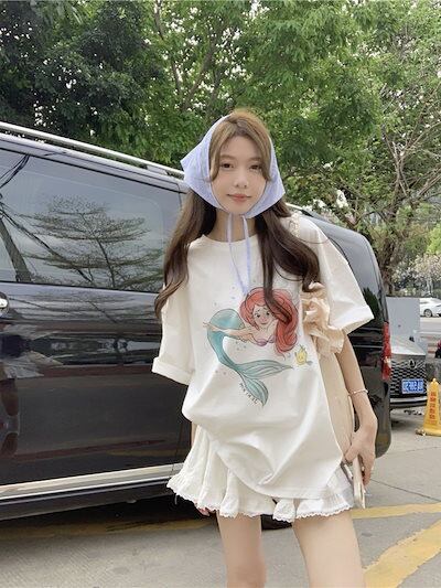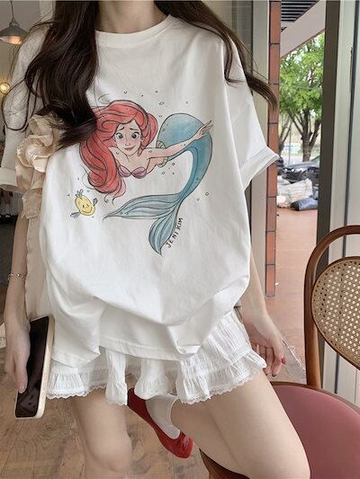 可愛いキャラクターマーメイドプリント半袖Tシャツレディース夏2025新型ゆったり丸首ミディアムカジュアルトップス