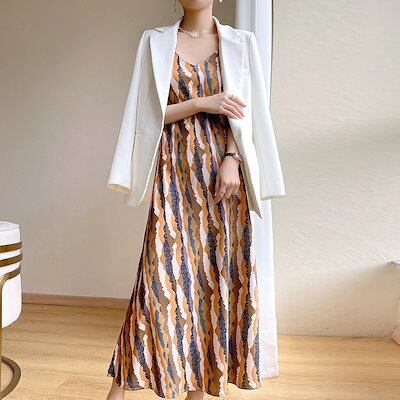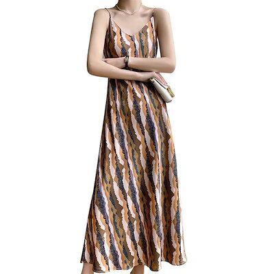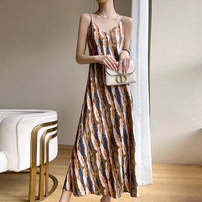 24シルクサテン新作レディースロングワイドドレスvネックストライプ再購入プリント気質多目的ドレス
