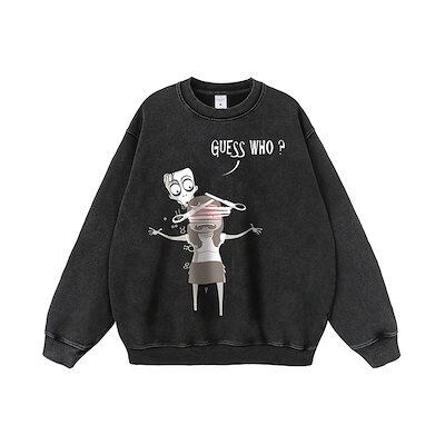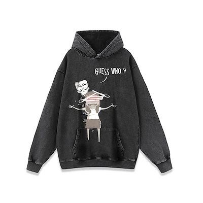 【急速出荷】アメリカン ストリート ヴィンテージ パロディー アニメ ホワイト インク ダイレクト プリント ウォッシュ加工とダメージ加工を施したメンズとレディースのフード付きスウェットシャツ