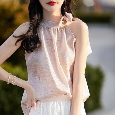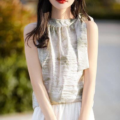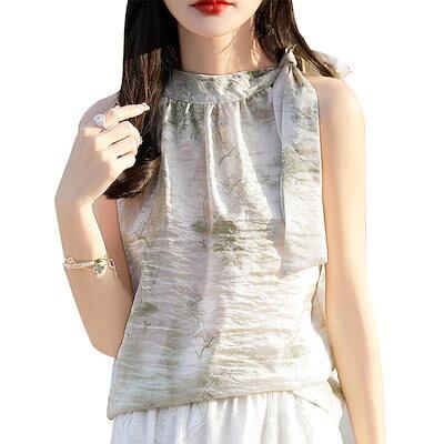 【急速出荷!】フラワーノースリーブ 25 新作 レディース ラウンドネック ショート丈 プリントTシャツ 薄手 ボトムス シャツ ノースリーブ タンクトップ